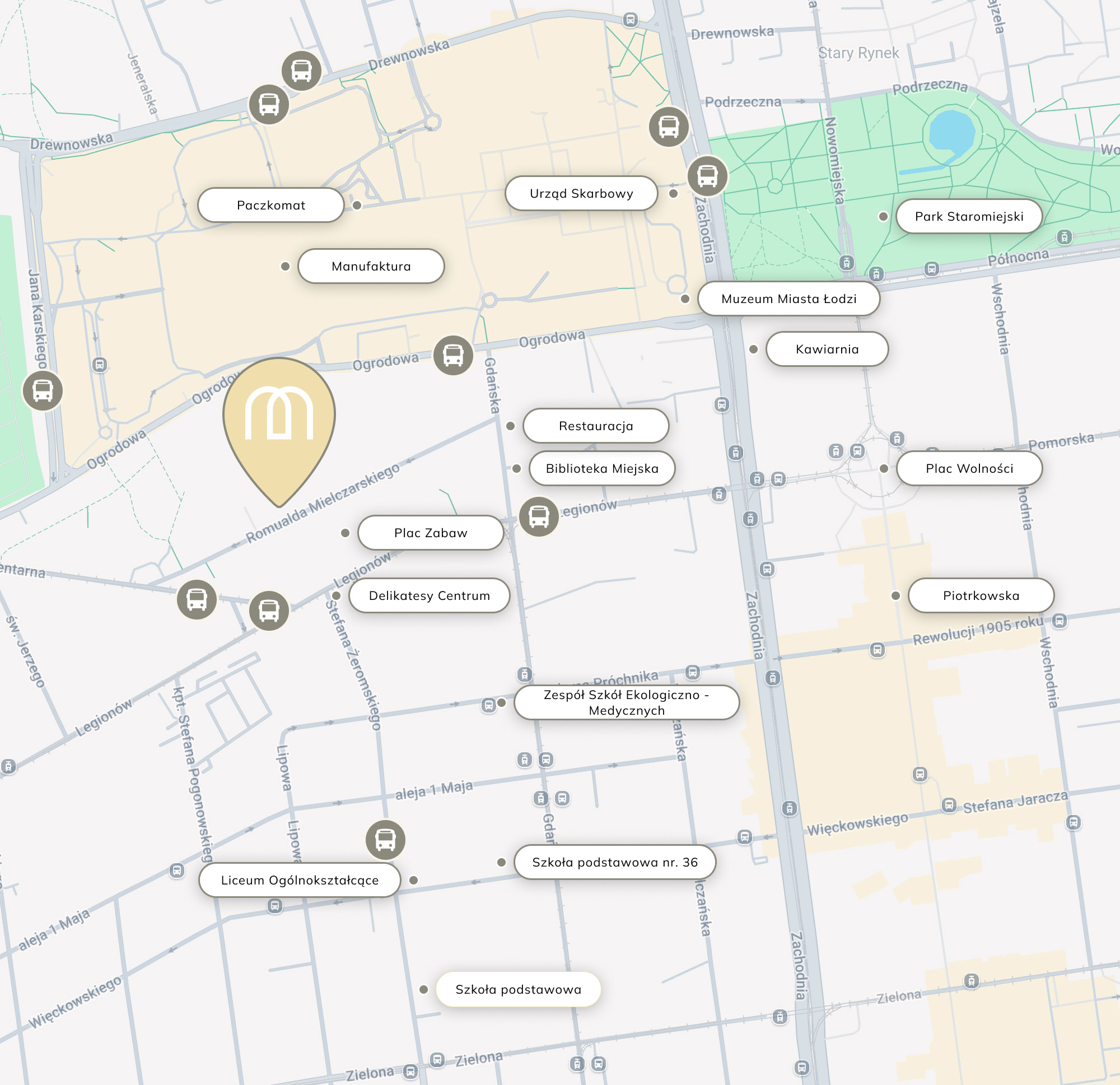 Lokalizacja inwestycji Mielczarskiego 23 jest wyjątkowa nie tylko ze względu na najbliższą okolicę. Od Piotrkowskiej, czyli najbardziej reprezentacyjnej ulicy Łodzi dzieli nas 15 minut spacerem. W podobnym czasie dostaniemy się do centrów rozrywkowych takich jak Atlas Arena, czy Aquapark „Fala”. Dodatkowym atutem jest bliskość terenów zielonych — piękny Park Helenów to niecałe pół godziny spaceru od kamienicy. Ze względu na dobrą komunikację z jednostkami uczelni wyższych, inwestycja jest atrakcyjną miejscówką dla studentów.
